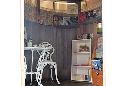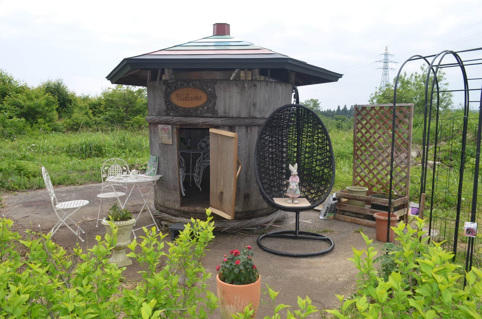 庭の酒樽はミニ読書&談話室(夜と冬は利用不可)